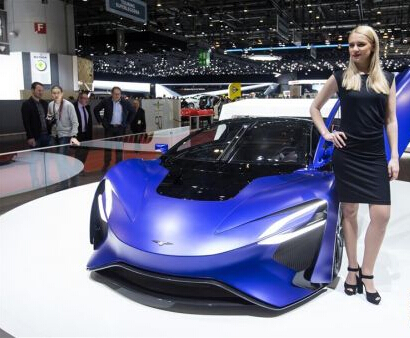 在瑞士日內瓦車展上,中國新興汽車研發企業泰克魯斯推出的“泰克魯斯·騰風”概念車。泰克魯斯概念車的理念是將微型化的航空燃氣渦輪機安裝在電動汽車上,燃燒天然氣等清潔燃料發電,給汽車上的電池充電。