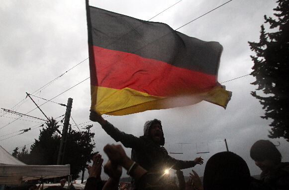 3月7日,在希腊靠近马其顿边境的伊多迈尼,一名难民在集会中挥舞德国国旗。