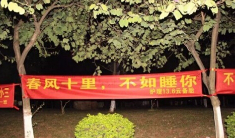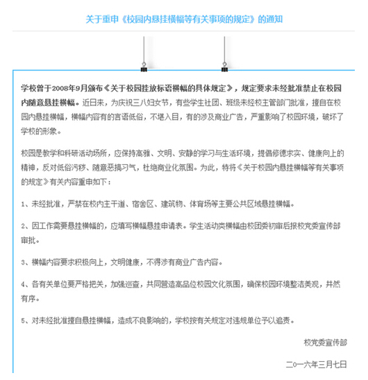 其中有一些横幅,内容太“污”,引起了网友的热议。更有网友直指:这是对女生的性骚扰。“并特别贴出了”关于重申《校园内悬挂横幅等有关事项的规定》的通知“,提醒同学们规范横幅内容,维护学校形象。