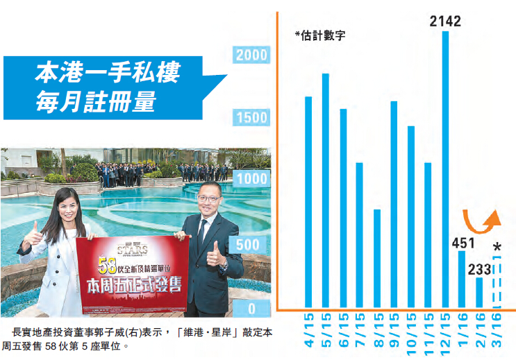 盡管發展商積極推出新盤,本港3月份一手成交量有望回暖,然而,3月份成交主要會反映在4月份的買賣註冊數字上,而去年12月份及今年首2個月,受市場氣氛急速惡化及多個節日長假期影響,全港新盤銷售極為低迷,因此2016年首季一手買賣註冊量難擺脫創新低的局面。