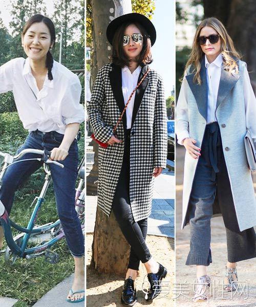 代表人物:奥利维亚·巴勒莫(Olivia Palermo)&Lady Gaga&艾玛·沃特森(Emma Watson) 美国第一名媛奥利维亚一身西装搭配白衬衫,西装外套微微敞开,再穿上高跟鞋,随意散下的卷发更添女人味。Gaga小姐也有正经的时候啊,扣齐了衬衫和外套的纽扣,气场十足。才女艾玛以短款的白衬衫搭配西装裤,摆脱了老气和乏味感。 代表人物:唐艺昕 最近唐艺昕在某水果台的热播剧《因为爱情有幸福》中扮演一名编剧的角色,各种白衬衫的穿法更能展现现代独立女性的形象。 想学白衬衫如何穿出休闲感的看这边! 代表人物:唐嫣&奥利维亚·巴勒莫(Olivia Palermo) 表姐刘雯出了名的好衣品,看她一身白衬衫随意地扎进牛仔裤内就非常好看了,丝毫不见白衬衫的白领feel。杨幂用白衬衫来搭配黑色铅笔裤,外加一件千鸟格大衣,牛津鞋和礼帽的搭配更增加英伦风。奥利维亚则用白衬衫来搭配阔腿裤,这样穿休闲了几分,跟着名媛出镜了无数次的长款马甲大衣更使搭配形成一体,走路都有带风感了。