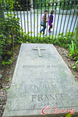 广州博物馆研究员陈鸿钧说,广州博物馆仲元楼展区(原广州美术馆)碑廊入口处有一方法文墓碑,麻石质,形制完整,放置于乱石杂草中多年。日前,博物馆招聘了一位法语专业的员工对碑文进行翻译,大致是,该碑是为1860~1861年为法兰西死亡的海员建立的。