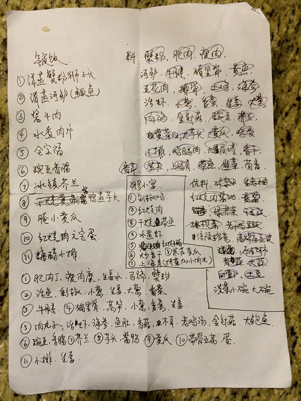 2014年春节是我做的年夜饭。我之前还列了单子,提前去菜场买菜。烧了一个干烧黄鱼,把它留着第二天才吃,意在年年有鱼(余)。我还做了类似于火锅的全家福,烧了扣肉、素什锦、冬笋烤塔菇菜、辣椒炒鸡、豆腐、鸡汤……大概二十几个菜,大家其实也不太吃得下去,但是过年总是要弄一桌子菜,热热闹闹才对。