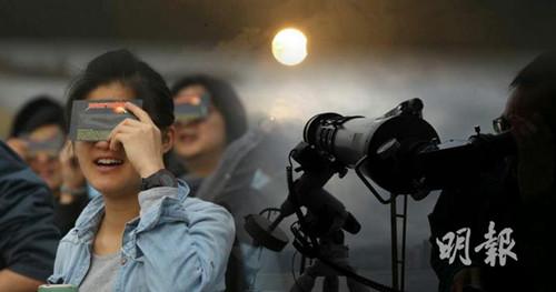 据香港《明报》网站报道,香港上空出现日偏食天文现象,虽然今日多云有雾,但不少市民都到户外观赏这少见现象。香港天文学会亦在中环摆档齐齐看日偏食。