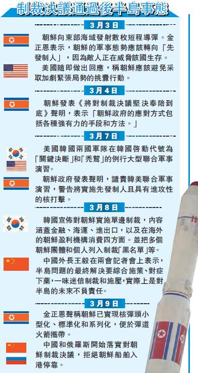 聯合國安理會2日一致通過涉朝問題第2270號決議,譴責朝鮮進行核試驗和使用彈道導彈技術發射衛星,決定實施一系列制裁措施遏制朝鮮的核、導開發計劃,并呼吁恢復六方會談。而對此,朝鮮於3月3日用6枚短程導彈作出了回應。