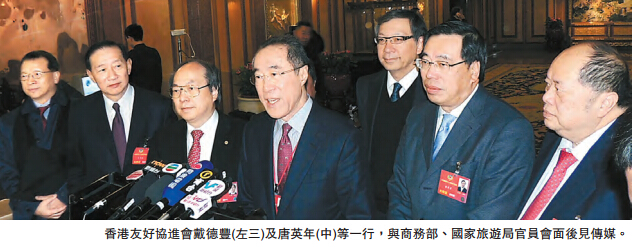 香港友好协进会成员包括全国政协常委唐英年、该会会长兼全国政协常委戴德丰等,昨早以该会辖下的经济事务委员会主任名义,会见商务部副部长王受文等官员。