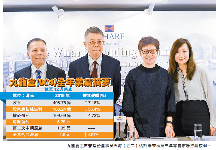 另外,在零售市道轉弱及樓市跌勢未明下,本港發展商未來業務表現普遍被外界看低一線。不過,吳天海卻指出,雖然預期零售市道未來兩至三年仍會疲弱,但九倉旗下兩大商場仍有「加租」可能。他又指出,旗下豪宅「聶歌信山」及油塘「Peninsula East」項目部分收益可於今年入帳,有機會提高銷售收入。
