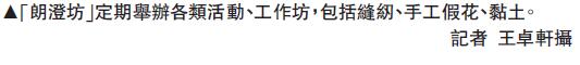像環保婆婆這類精神已經穩定的康復者,「朗澄坊」主要透過舉辦各類活動、工作坊,讓他們融入社會。環保婆婆逢星期一、星期三到中心縫紉,就是「朗澄坊」舉辦的活動之一「職業治療日間小組」。記者到訪時發現,除了有會員與環保婆婆一起縫紉之外,在場其餘10多個會員一起製作手工假花、黏土,其樂融融。