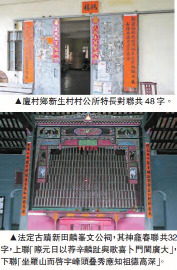 新界圍村貼對聯以過年最盛,那一對神聯:「春夏秋冬行好運,東南西北遇貴人」更是逢村遇上,家喻戶曉。但除了家門前的春聯,圍村里的祠堂、圍門、神廳、廟宇、社壇、井頭也會張貼對聯,且各有特色,處處洋溢著濃郁的春意。