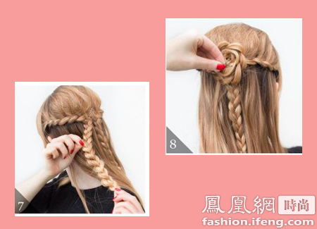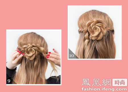 step1,2 step1:把头后的全部头发上下一分为二,将上一半的头发从后往前梳。 step2:把上一部分头发用发夹固定于脑后。 step3,4 step3:取下面的靠近鬓角额一缕发量适中的头发编成麻花辫。 step4:编辫子的时候顺着之前发夹的印记编。 step5,6 step5:编好的麻花辫如图5所示,是从鬓角弯曲至后脑勺中部的形状。 step6:另一边也是按照step1—5编成对称的麻花辫。 step7,8 step7:取其中一缕麻花辫,在后脑勺中部用发夹固定好位置。 step8:将这缕麻花辫以发夹为中心,一圈圈卷起,用发夹固定好。 step9,10 step9:另一根麻花辫也这样绕在之前发盘上。 step10:用发夹固定好,就完成啦~ 是不是很简单就能get到呢~那就快来试试看吧!