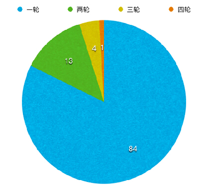 在102個投資項目中,順為資本對18個項目進行了多輪投資。其中參與兩輪投資的有13個項目,參與三輪投資的4個項目,參與四輪投資的僅有1個,84個項目僅參與了一輪投資。