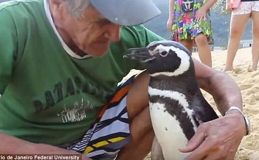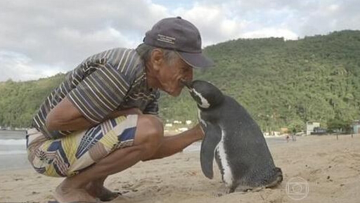 2011年,巴西一位老人救下了一只濒死的企鹅,然后将它放归海里。没想到,此后的每一年,企鹅都会游行约合8047千米回来看他,与他亲密地相处8个月再离开,今年已经是第5个年头。“我就像爱自己的孩子那样爱着企鹅,我相信它也爱我”,老人说。