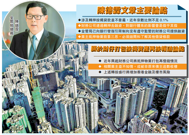 陳德霖其后大舉列出種種「數據」,強調據當局了解,涉及轉押的按揭貸款并不普遍,在2014年全年和2015年首三季的按揭登記中,共有超過14萬宗按揭登記,轉押宗數只有約120宗,轉押比例不足0.1%,其中更只有約10宗由銀行作為貸款人提供資金。由此可見,財務公司透過轉押去融資,對銀行體系的影響微乎其微。