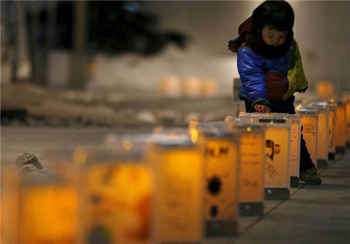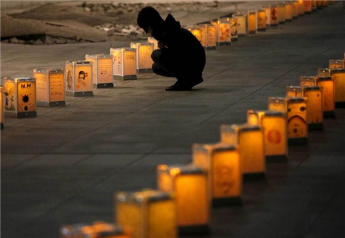 当地时间2016年3月10日,日本东京,来自宫城县名取市的灯笼被点亮,纪念日本“3·11”大地震。2011年3月的这场灾难令近16000人失去生命,超过2500人至今下落不明。直到今天,家人们也从未放弃过寻找亲人的尸骨,他们希望逝者安息,这场噩梦能就此终结。图为街头的灯笼被点亮。