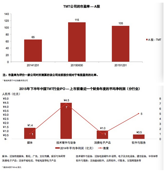 截至2014年12月31日,在A股上市的TMT公司市盈率到達65倍;截至2015年6月30日,在A股上市的TMT公司市盈率到達115倍;截至2015年12月31日,在A股上市的TMT公司市盈率到達105倍。
