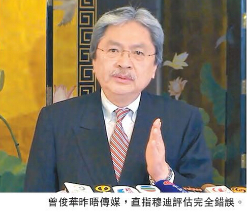 穆迪发表消息后,曾俊华首先透过政府新闻处发表回应;并於午前出席一个活动后再晤传媒,连番作出回应。曾俊华指出:「我觉得他是错误评估了,他对香港和中国,我们是有一个密切的关系,但他们就觉得这是一个『中国风险』,但其实这应该是一个『中国机会』。」港府会继续与穆迪和其他不同的评级机构讨论这一问题。
