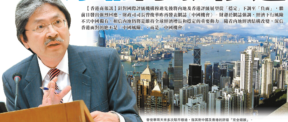 【香港商报网讯】针对国际评级机构穆迪先後将内地及香港评级展望从「稳定」下调至「负面」,继前日发出强烈回应,财政司司长曾俊华昨再发表网志《中国机会》。财爷於网志强调,经济下行风险不只中国独有,相信内地仍将是维持全球经济增长和稳定的重要动力。随内地经济结构改变,深信香港面对的绝不是「中国风险」,而是「中国机会」。