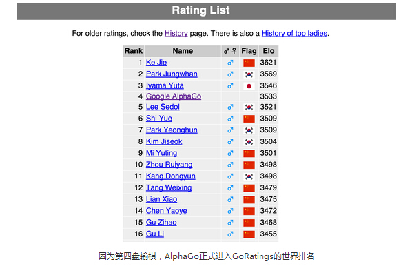雖然在第四盤比賽輸給了李世石,但AlphaGo卻意外得到了另一個收獲。由於這場失利,它可以正式進入世界職業圍棋選手排名了。目前在世界職業圍棋排名網站GoRatings.org上,AlphaGo已經排名世界第四,僅次於中國柯潔、韓國樸廷桓以及日本井山裕太。而AlphaGo此次擊敗的韓國棋手李世石則位列世界第五。