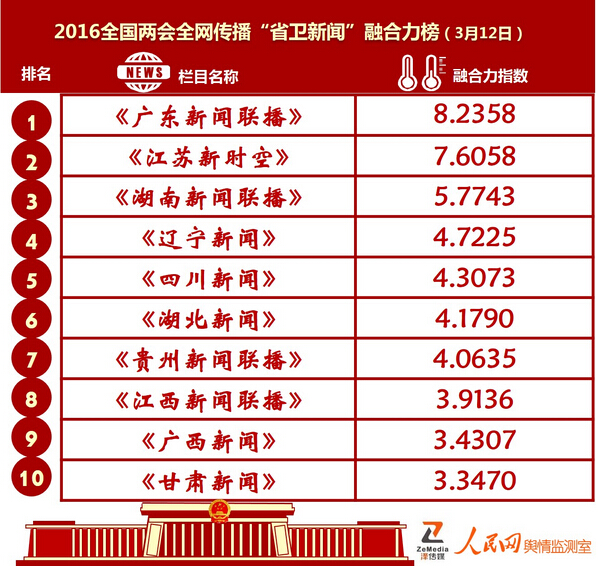 日前,由“人民网-泽传媒”共同打造的2016全国两会全网传播“省卫新闻”融合力榜单第11期出炉。截至3月13日12时,在全国36家省级上星频道3月12日晚所播联播中,《广东新闻联播》以融合力指数8.2358再度夺得“2016全国两会全网传播‘省卫新闻’融合力榜”冠军,《江苏新时空》以7.6058位居亚军,《湖南新闻联播》以5.7743位列第三。《辽宁新闻》《四川新闻》《湖北新闻》《贵州新闻联播》《江西新闻联播》均有提升,分列于第四至第八。