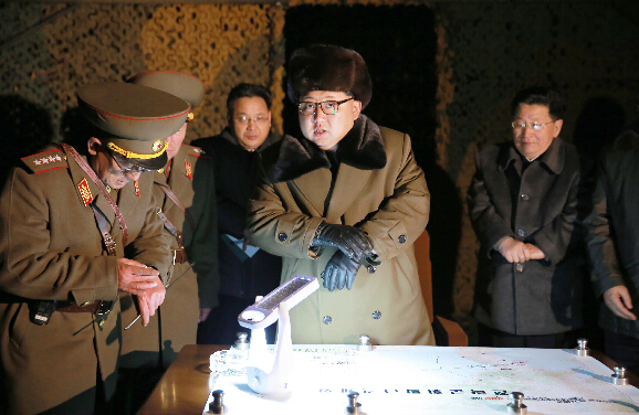 金正恩(中)11日观摩了朝鲜人民军战略部队弹道火箭发射训练。朝中社