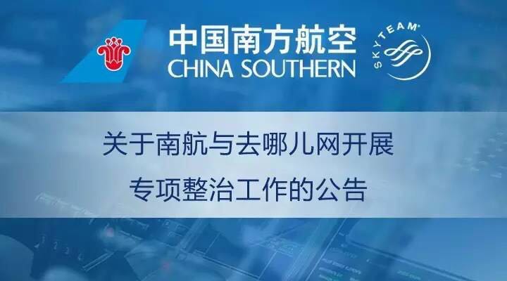 3月14日,南方航空發布《關于南航與去哪兒網開展專項整治工作的公告》,稱為盡快杜絕網絡違規銷售行為、凈化機票銷售市場、保障旅客的合法權益,南航已要求去哪兒網于3月13日起正式下架所有南航機票銷售,并針對此前發生的投訴進行徹查。一經查證為南航授權代理所為,南航將對涉事代理進行處罰并取消其代理資格。