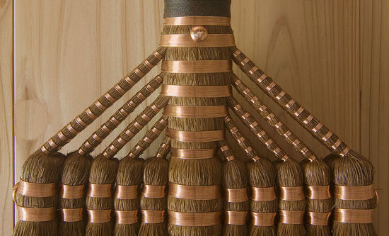 这种棕榈丝又叫鬼毛棕,经过选料、去叶鞘、分选、压软、润湿、扎结、熏蒸等复杂的几道工艺程序,配上棕挂绳和铜线编扎,一把手工扫帚就完成了。铜线质感细腻,和黑褐色的麻绳混合编织。棕丝不会引起静电,不用担心缠绕头发的问题。