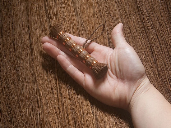 棕榈扫帚职人西尾香织师从名匠人桑添勇雄,传承了从江户时代开始流传的制箒技艺。不同于常见的高粱糜子、弹力丝扫把、鬃毛扫帚,这个叫“棕榈荒神帚”的扫帚原料采自当地棕榈树叶鞘,韧性好,耐水性强。由于棕榈树皮中含有丰富的植物性油脂,所以制成的扫帚看起来像上过蜡一样光泽感饱满,不易腐蚀,能使用 20 年以上。
