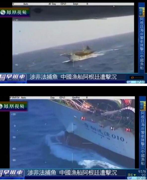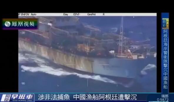 中国一艘远洋渔船涉嫌在南美阿根廷水域非法作业捕鱼,日前遭到阿方海岸警卫队开火击沉,船上人员获救。