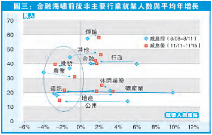 主要行業如此,其他又如何?第一,圖三見到在非主要行業(就業人數低於全澳平均),2011年減息前共有4個行業出現就業人數下跌情況,2011年至今則減至3個。其次,運輸及金融業情況每年都有不俗增長,優於其他較小型的行業。雖然礦產業跌幅頗大,但由於就業人數少於大部分行業,故對就業市場影響不算大。故此,圖二及圖三見到,自2011年澳洲儲備銀行減息撐經濟,似乎對就業市場產生了積極的支持作用。