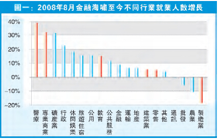 不過,當筆者觀察澳洲儲備銀行自2011年開啟減息周期后,整體上似乎發生了一點變化。圖二見到,在一眾主要行業(就業人數多於全澳平均),由2011年8月央行減息后至今,就業情況出現明顯改善。除了醫療行業的人數出現跌幅外,排第二的零售業及其后行業的就業人數均出現不俗增長(按年平均變動),而且增幅亦大於減息前(由2008年8月至2011年8月央行減息前),反映主要行業的就業境況正逐漸由谷底復蘇。由此可見,澳洲儲備銀行的減息似乎有效。
