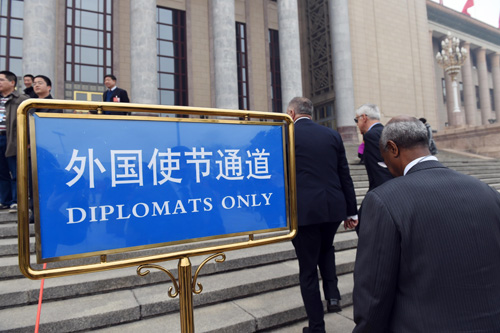 3月3日,全国政协十二届四次会议在北京开幕,各国驻华使节列席旁听。 中新社记者 刘震 摄
