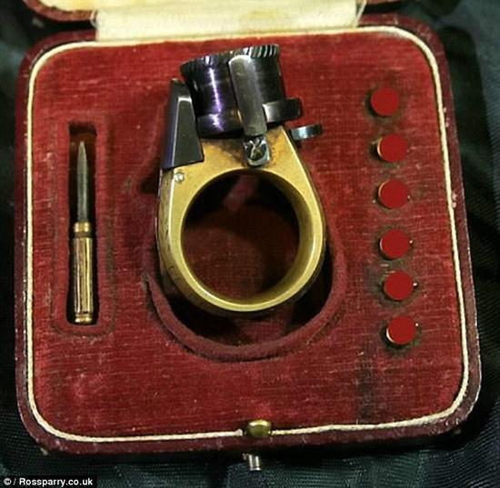 这把微型武器是第一把登记在册的指环枪。这种枪因为足够小——只有指甲盖那么大,且被安装在指环上而得名,看上去就像间谍大片里的特种武器。