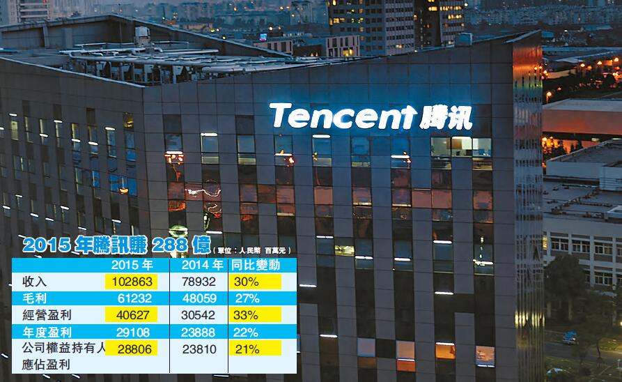 【香港商报网讯】记者刘佳玲报道:TMT巨头腾讯(0700)昨日发布去年全年业绩,公司持有人应占盈利为288.06亿元(人民币,下同),较2014年上升21%,但较市场预计的298.96亿元盈利少。每股基本盈利为3.097元,每股摊薄盈利为3.055元。派发末期息每股0.47港元。