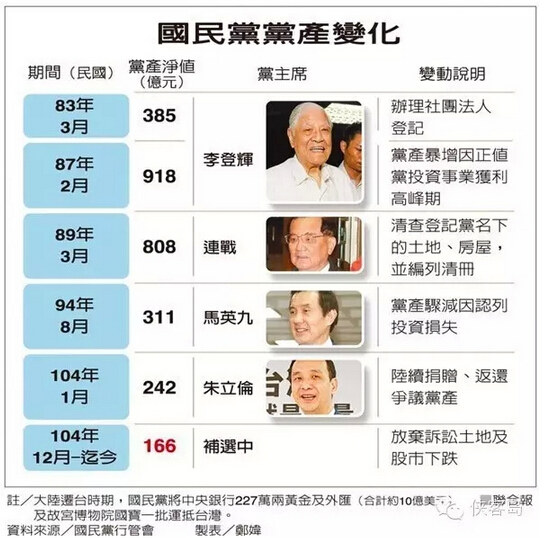 有公開資料顯示, 1998年李登輝任主席時期,黨產最多達918億元;2000年連戰當黨主席時,黨產有808億元;2005年馬英九任主席時,黨產有311億元;2015年1月朱立倫成為黨主席時,黨產有242億元。也是,這數據跟島內的政治氣候密切相關。隨著國民黨從一黨獨大變為與綠營競爭,其黨產市值縮水勢所難免。