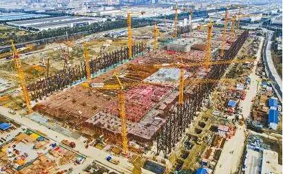 事實上,生產線項目占地僅40萬平方米。但整個項目現場,卻緊密分布了16臺大型塔吊,這些塔吊的臂展長達70米,但每兩臺塔吊豎直支架間的距離卻只有74米。