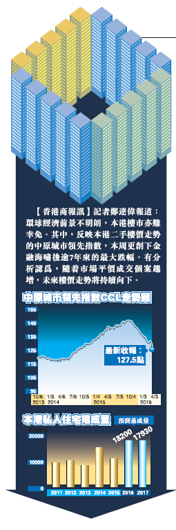 【香港商報网訊】記者鄭達偉報道:環球經濟前景不明朗,本港樓市亦難幸免。其中,反映本港二手樓價走勢的中原城市領先指數,本周更創下金融海嘯後逾7年來的最大跌幅。有分析認為,隨着市場平價成交個案趨增,未來樓價走勢將持續向下。