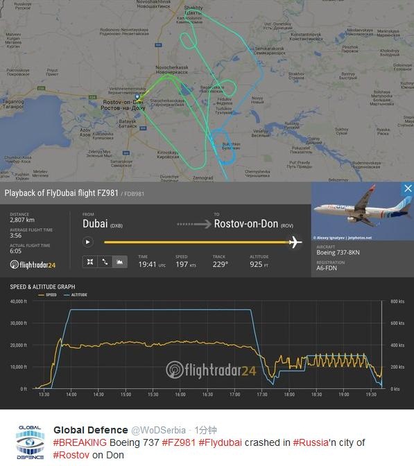 據俄羅斯航空業人士稱,這架客機屬于FlyDubai航空公司。客機在第二次降落時墜毀在距離跑道50到100米的地面上,墜毀時能見度差。