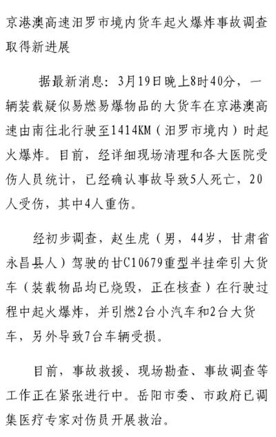 湖南高速交警表示,目前,經詳細現場清理和各大醫院受傷人員統計,截至3月20日淩晨,該事故已致5人死亡,20人受傷,其中4人重傷。