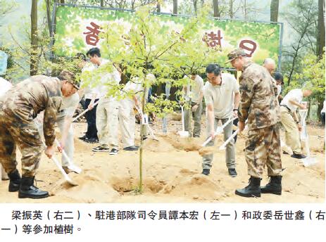 【香港商報訊】香港一年一度的植樹日活動昨日在元朗舉行,解放軍駐港部隊約700名海、陸、空官兵參與此次活動,與逾千名市民攜手種下8000棵樹苗。行政長官梁振英、中聯辦副主任林武、外交部駐港特派員公署副特派員宋如安、解放軍駐港部隊司令員譚本宏、政治委員岳世鑫出席植樹日活動并擔任主禮嘉賓。