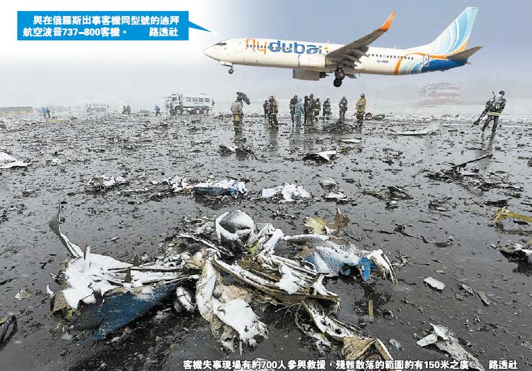 出事的波音737-800客機,由迪拜起飛,當日凌晨降落羅斯托夫,但事發時落大雨,當地并發布了風暴預警,能見度低,客機首次嘗試降落不成功,盤旋上空約兩小時,再嘗試降落時,偏離跑道墜毀,機身爆炸解體。俄塔斯社則指出,除了惡劣的天氣狀况,飛行員的處理失誤也導致了今次的墜機悲劇。據初步判斷,失事客機在第二次試圖降落時機尾刮蹭地面。