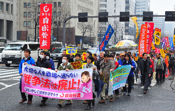 大批日本民众3月19日冒雨汇聚东京市中心的日比谷公园举行集会,强烈要求废除以解禁集体自卫权为核心内容的一系列新安保法。现场统计与会人数达5600人。