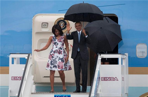 奥巴马和第一夫人米歇尔及2名女儿乘坐空军一号,当地时间下午4时许抵达哈瓦那机场。由於正在落雨,奥巴马手持雨伞,与妻子米歇尔一起下机,奥巴马不时微笑挥手,2名女儿亦尾随步出机舱。古巴领导人劳尔没有到场,但就派出外长罗德里格斯到场迎接。