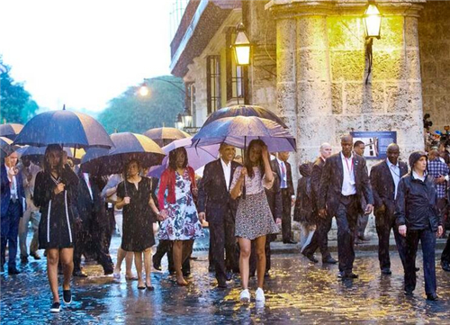奥巴马又与家人冒雨步行参观哈瓦那旧城区,包括天主教堂。在教堂外有数百人聚集,部份人鼓掌及高叫奥巴马的名字。