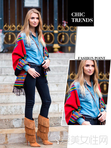 牛仔衬衫搭配铅笔裤就是最常见的搭配,将牛仔衬衫扎进裤子里,再系上细皮带,拉长腰身,流苏的细跟尖头中靴还是十分有型的,不过这种搭配未免也太普通了。
