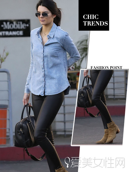 So 你可以尝试一下皮裤,黑色的皮裤依然可以显瘦,牛仔衬衫即使不扎进裤子里,尽显随性也很不错,搭配短靴让你的腿部展现更多出来,更显修长哦!
