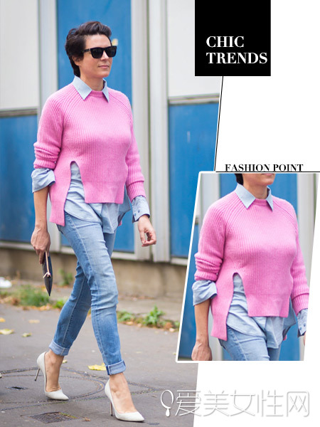 牛仔衬衫+毛衣 温暖耐看最动人 牛仔衬衫搭配毛衣也是很常见滴,前短后长加上开衩设计本来还蛮特别的,但是这种娇滴滴的粉色可不是谁都可以驾驭的,万一穿不好,别说可以穿出好气色,分分钟让你显得更黑呢,不过白色的尖头高跟鞋搭配得不错,瞬间清爽了许多!