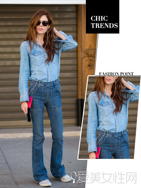 喇叭裤型的牛仔裤也非常不错,打造复古风,而且好美的腿型!搭配牛仔衬衫,深浅的色差对比,摆脱单调。