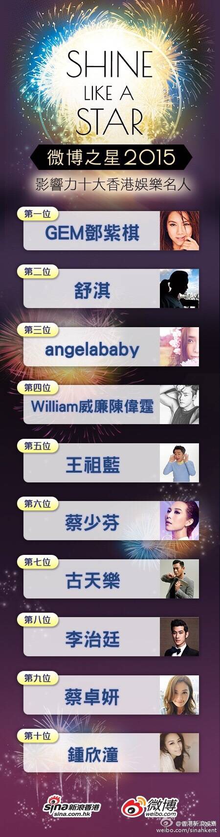 ▲「微博影響力十大香港娛樂名人」第十位:@鍾欣潼 ;第九位:@蔡卓妍 ;第八位:@李治廷 ;第七位:@古天樂;第六位:@蔡少芬 ;第五位:@王祖藍 ;第四位:@William威廉陈伟霆 ;第三位:@angelababy ;第二位:@舒淇 ;第一位:@GEM鄧紫棋 !恭喜十位微博影響力的香港娛樂名人!