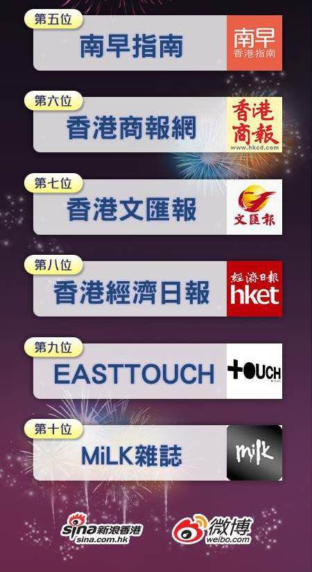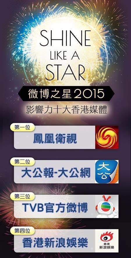 ▲微博總結了過去一年的數據如帳號發文量、閱讀數、互動率、覆蓋度等,評選了2015年微博十大最具影響力的香港媒體。獲獎媒體均能在微博上實時發布即時新聞以及帶領用戶參與話題討論,令新聞議題迅速炒熱,大大增加訊息傳播程度。「微博最具影响力十大香港媒体」第十位:@MiLK杂志 ;第九位:@EASTTOUCH ;第八位:@香港经济日报 ;第七位:@香港文汇报;第六位:@香港商报网 ;第五位:@南早指南 ;第四位:@香港新浪娱乐 ;第三位:@TVB官方微博;第二位:@大公报-大公网 ;第一位:@凤凰卫视!恭喜十大微博影響力媒体获奖!