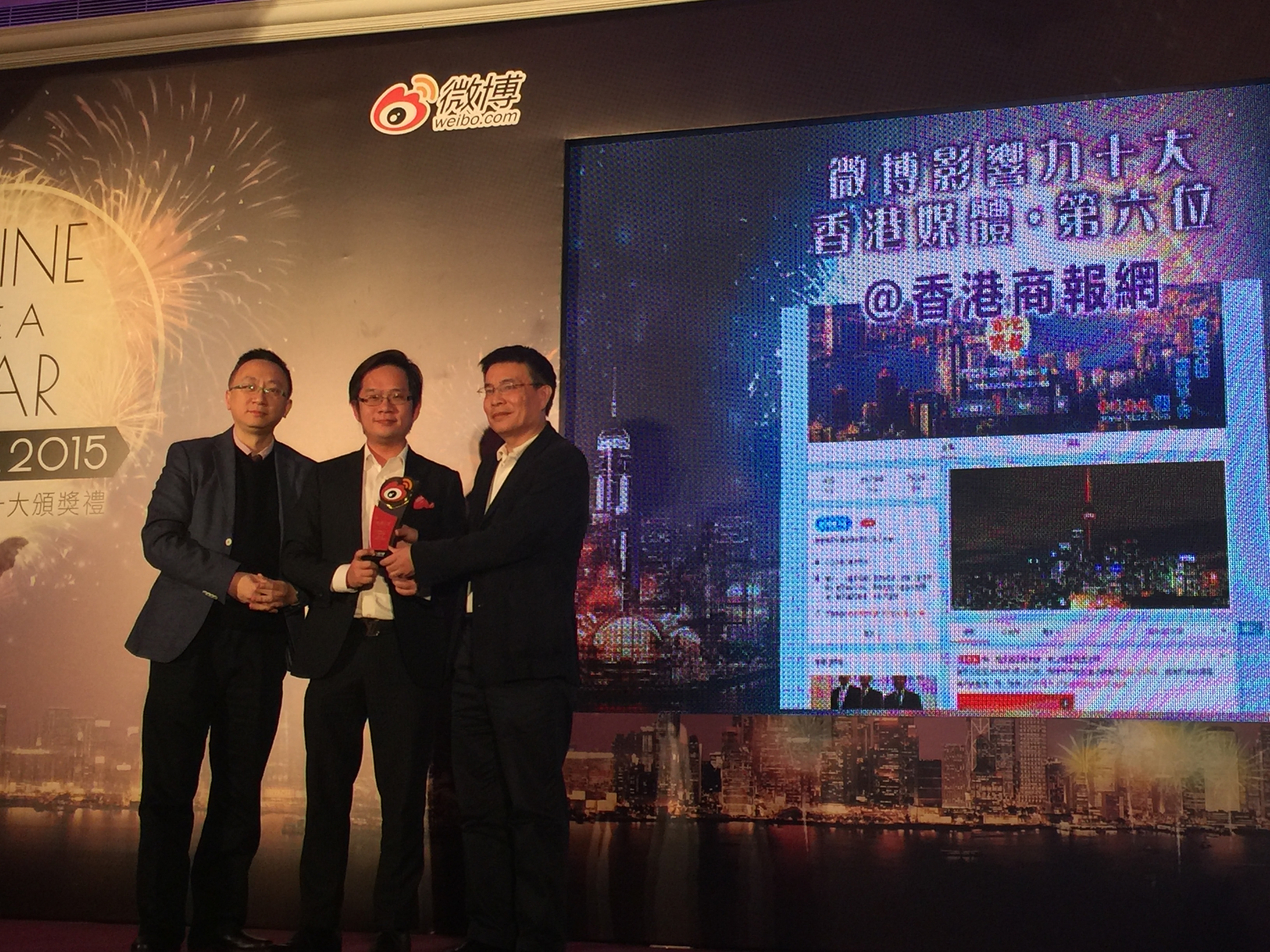 ▲@香港商报网 荣膺最有影响力香港媒体微博第六名,香港商报网总编辑肖健(右)与香港商报助理总经理胡智衡(中)上台领奖。